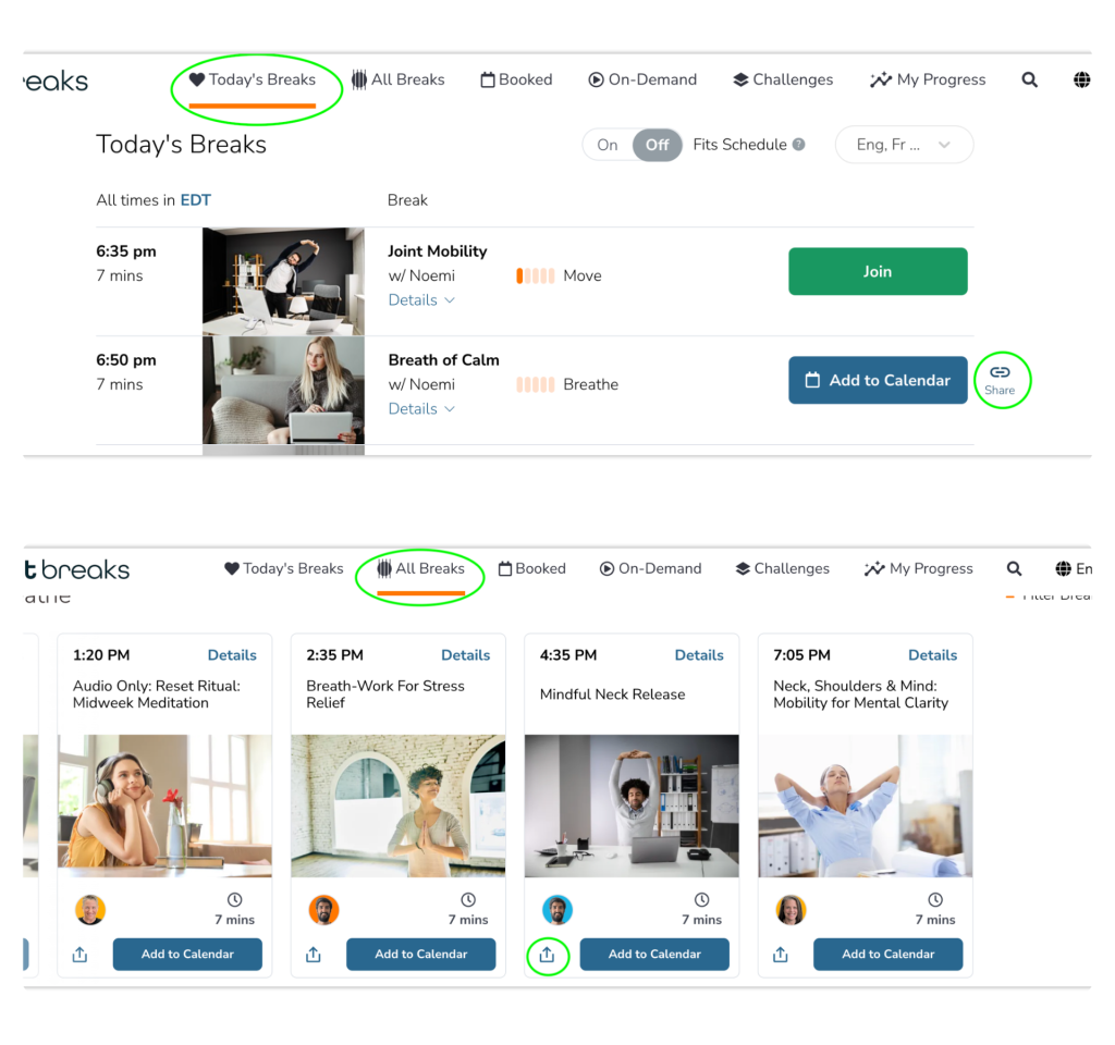 - Find the live break you’d like to invite others to in the Today’s Breaks or All Breaks tab.